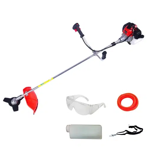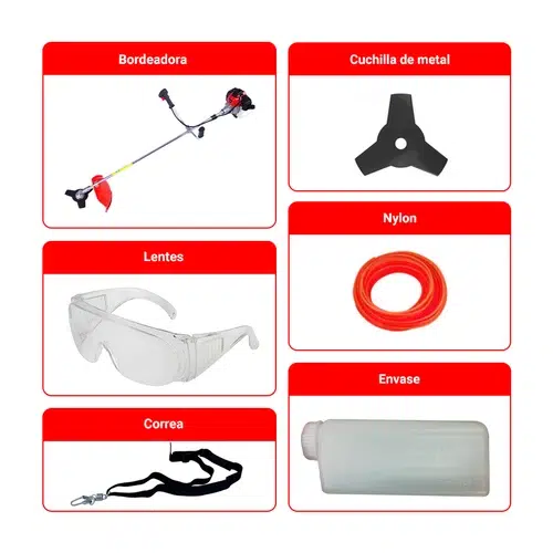- · Incluye accesorios: cuchilla metálica, cuchilla de nylon, lentes de protección, cable y correa
